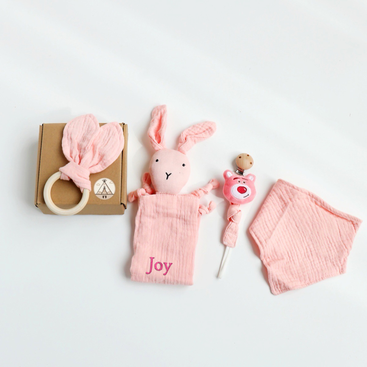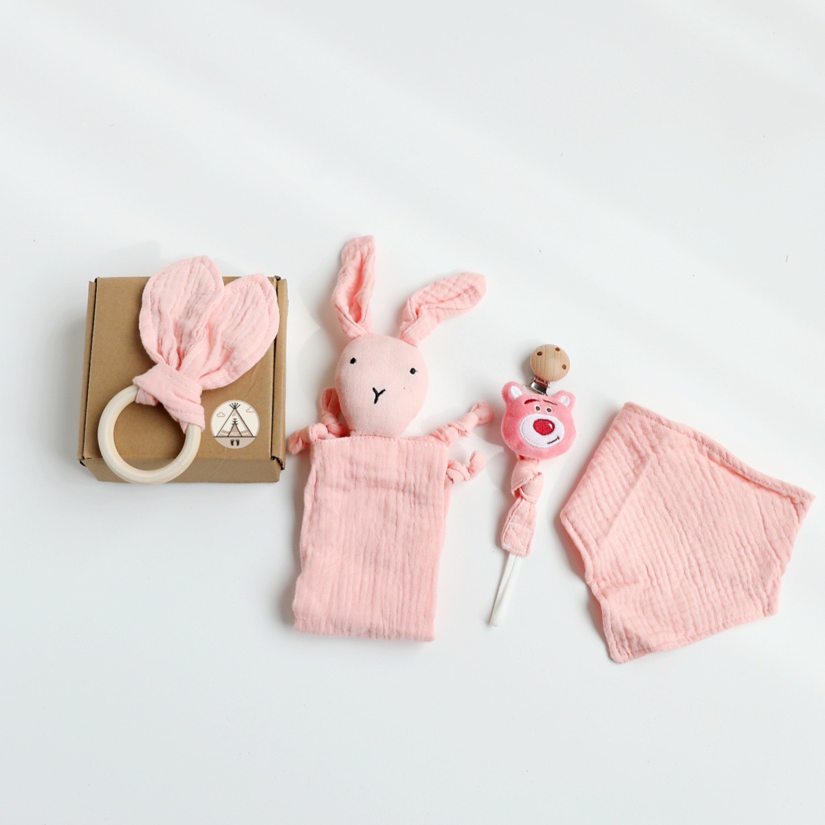 A cuddly muslin companion (bunny) — designed for snuggles, sleep, and sensory comfort.